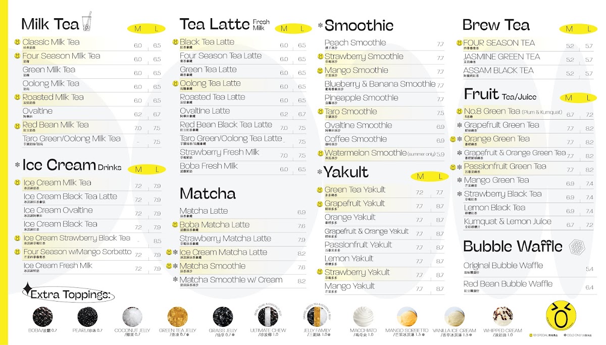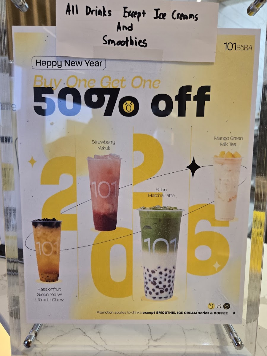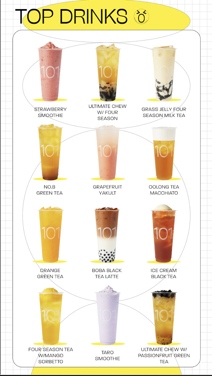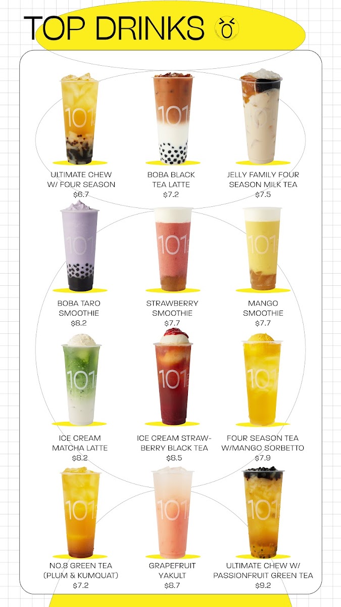 The menu at 101 Boba - Capstan Way offers a diverse selection of drinks and treats, catering to various tastes. For milk tea lovers, options like Classic Milk Tea, Four Season Milk Tea, and Green Milk Tea are available, alongside unique choices such as Roasted Milk Tea. The tea lattes also shine with flavors like Black Tea Latte, Four Season Tea Latte, and Oolong Tea Latte. For those craving something refreshing, the smoothies, including Peach Smoothie, Strawberry Smoothie, and Mango Smoothie, provide a fruity burst. Additionally, the brew tea section features comforting options like Four Season Tea and Jasmine Green Tea. Fruit teas and juices are also a highlight, offering varieties such as Grapefruit Green Tea, Passionfruit Green Tea, and Orange Green Tea. For something more indulgent, Ice Cream Milk Tea, Ice Cream Black Tea Latte, and Ice Cream Strawberry Black Tea are perfect sweet options. The Yakult drinks bring a tangy twist, with flavors like Green Tea Yakult and Passionfruit Yakult. Matcha enthusiasts can enjoy options like Matcha Latte, Boba Matcha Latte, and Matcha Smoothie. Rounding out the menu are the delicious Bubble Waffle choices, including the Original Bubble Waffle and the sweet Red Bean Bubble Waffle. With a variety of flavorful drinks and desserts to choose from, 101 Boba offers a satisfying experience for any craving.