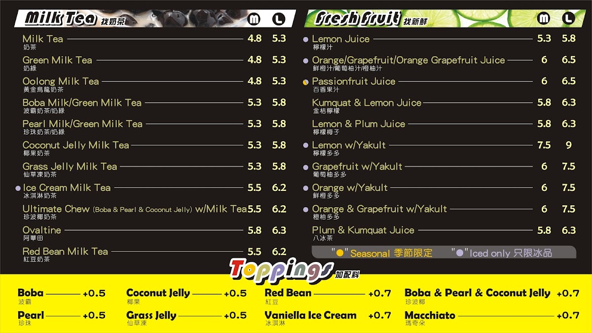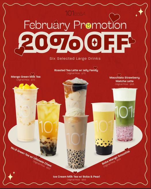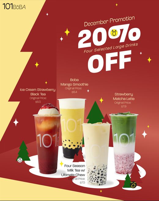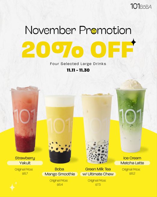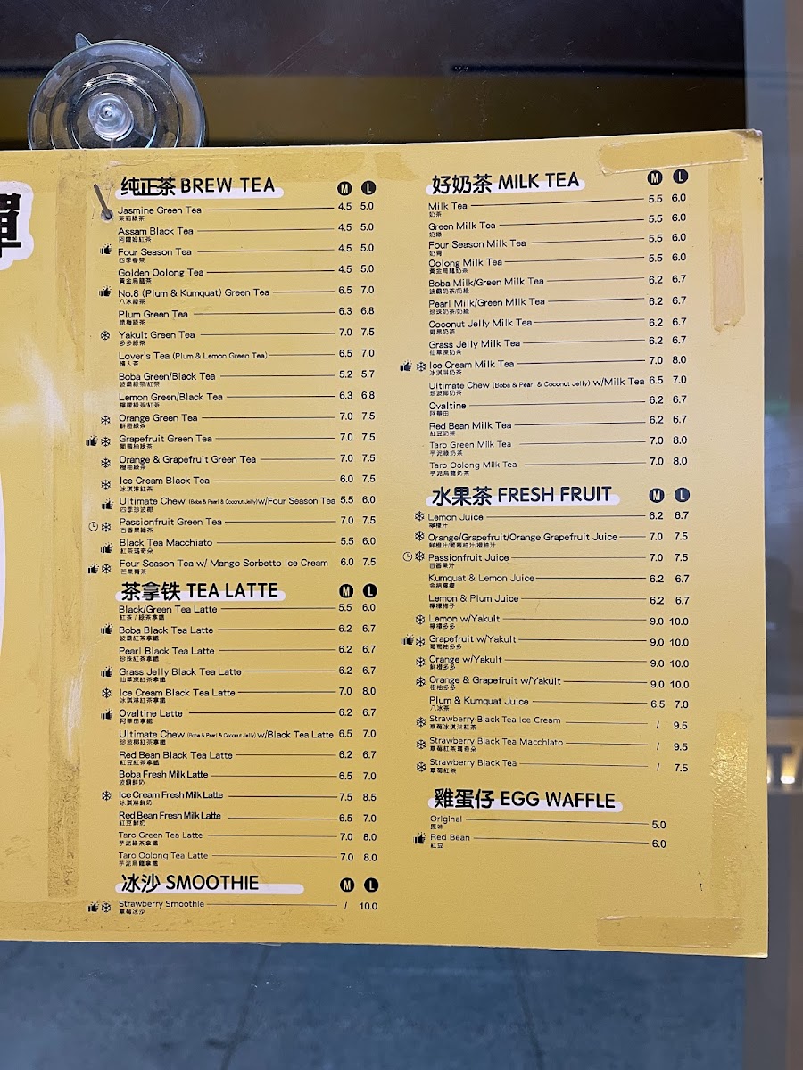 The menu at 101 Boba - Capstan Way offers a diverse selection of drinks and treats, catering to various tastes. For milk tea lovers, options like Classic Milk Tea, Four Season Milk Tea, and Green Milk Tea are available, alongside unique choices such as Roasted Milk Tea. The tea lattes also shine with flavors like Black Tea Latte, Four Season Tea Latte, and Oolong Tea Latte. For those craving something refreshing, the smoothies, including Peach Smoothie, Strawberry Smoothie, and Mango Smoothie, provide a fruity burst. Additionally, the brew tea section features comforting options like Four Season Tea and Jasmine Green Tea. Fruit teas and juices are also a highlight, offering varieties such as Grapefruit Green Tea, Passionfruit Green Tea, and Orange Green Tea. For something more indulgent, Ice Cream Milk Tea, Ice Cream Black Tea Latte, and Ice Cream Strawberry Black Tea are perfect sweet options. The Yakult drinks bring a tangy twist, with flavors like Green Tea Yakult and Passionfruit Yakult. Matcha enthusiasts can enjoy options like Matcha Latte, Boba Matcha Latte, and Matcha Smoothie. Rounding out the menu are the delicious Bubble Waffle choices, including the Original Bubble Waffle and the sweet Red Bean Bubble Waffle. With a variety of flavorful drinks and desserts to choose from, 101 Boba offers a satisfying experience for any craving.